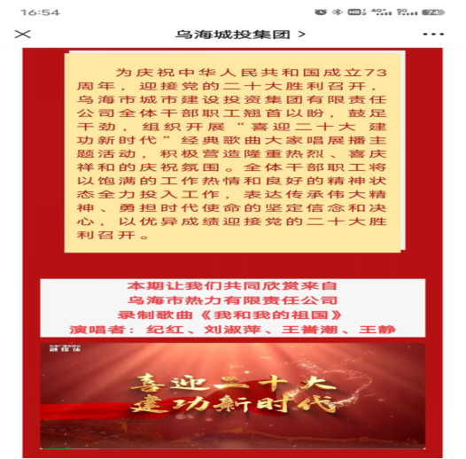 在黨中央確定今年下半年召開黨的二十大之后,市城投集團公司將喜迎黨的二十大作為2022年思政宣傳工作的重要主線,將其貫穿到企業(yè)經(jīng)營和生產(chǎn)服務(wù)工作全過程,組織策劃喜迎二十大系列活動,先后開展市城投集團公司“踔厲奮發(fā)新征程,迎接黨的二十大”我們的節(jié)日?中秋主題活動,組織黨員干部職工觀看紅色影片,組織開展“喜迎二十大 建功新時代”經(jīng)典歌曲大家唱展播活動,各子公司營業(yè)廳、辦公樓等場所張貼懸掛喜迎黨的二十大宣傳標語等,進一步統(tǒng)一思想、凝聚共識、匯聚力量,在干部群眾中引起熱烈反響,全面營造迎接黨的二十大的濃厚氛圍,以實際行動迎接黨的二十大勝利召開。