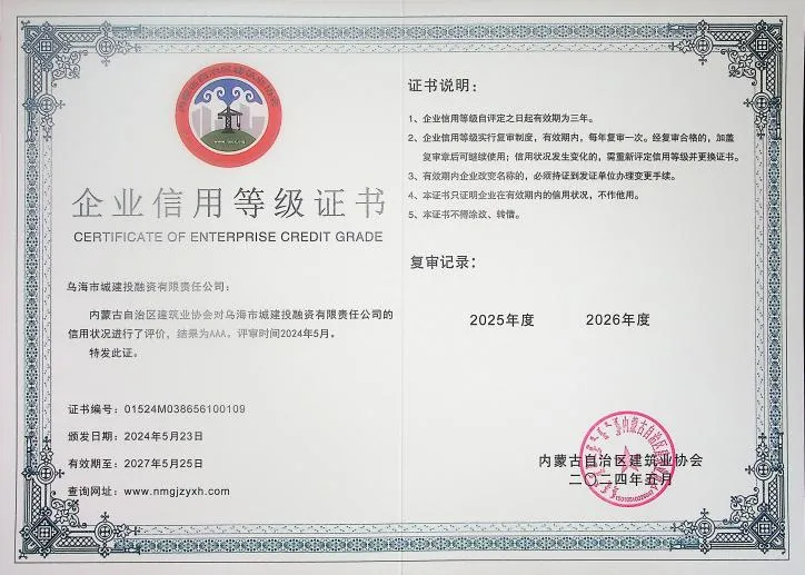 近日,經(jīng)內(nèi)蒙古自治區(qū)建筑業(yè)協(xié)會(huì)評(píng)選,烏海市城建投融資有限責(zé)任公司成功榮獲《2024年度內(nèi)蒙古自治區(qū)建筑業(yè)AAA級(jí)信用企業(yè)》稱號(hào)。此項(xiàng)殊榮的獲得,是對(duì)城建公司長(zhǎng)期以來在建筑業(yè)領(lǐng)域誠信經(jīng)營(yíng)、規(guī)范管理的充分肯定。