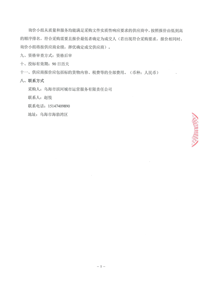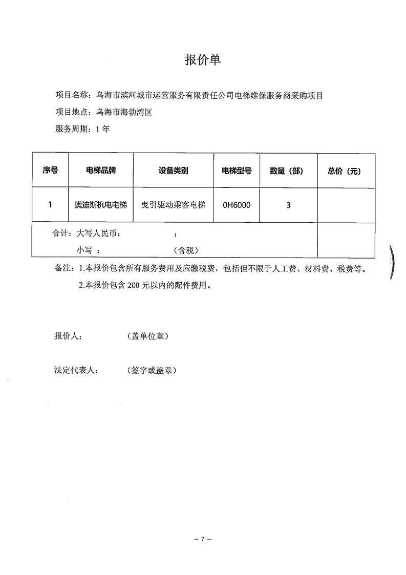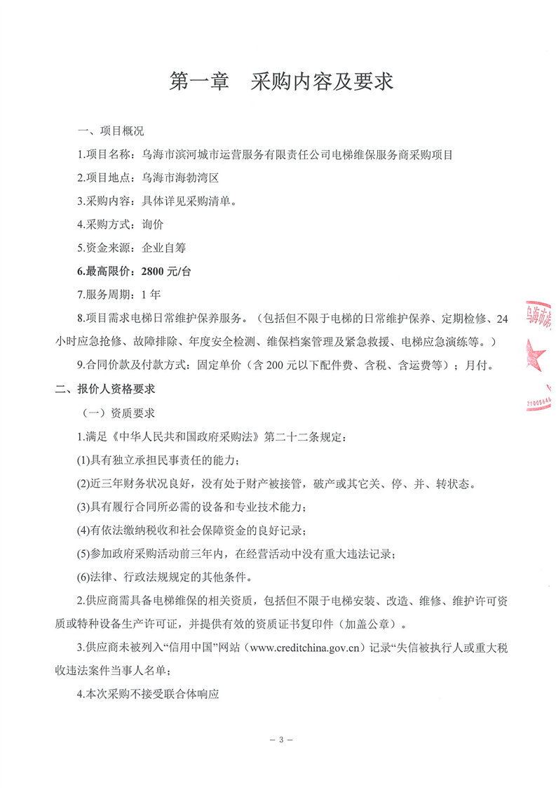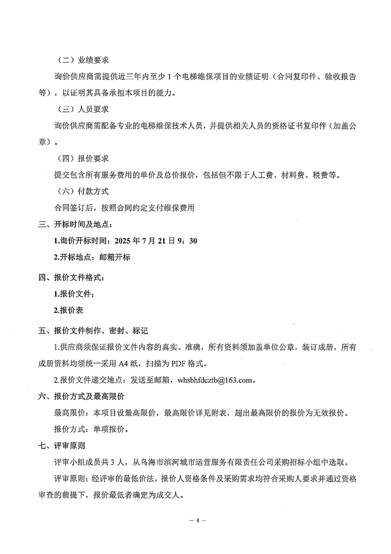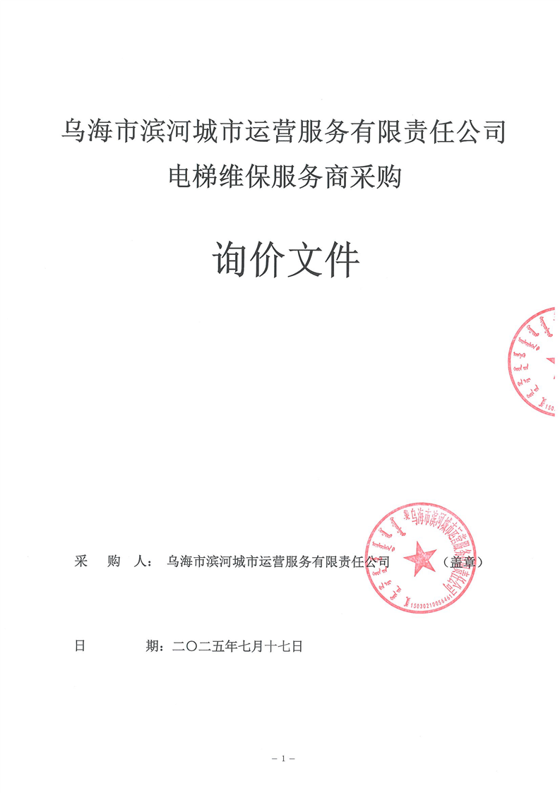 烏海市濱河城市運(yùn)營(yíng)服務(wù)有限責(zé)任公司電梯維保服務(wù)商采購(gòu)詢(xún)價(jià)文件